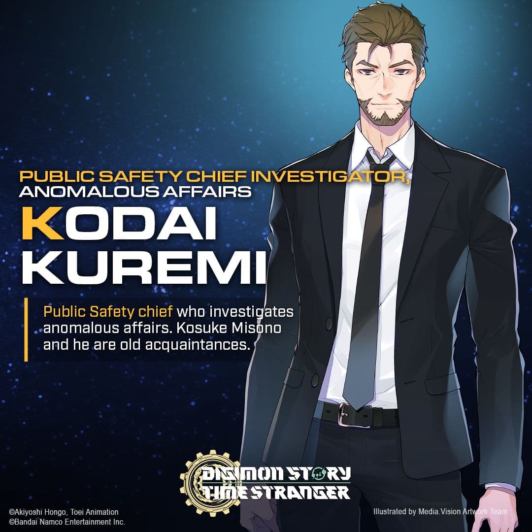 Kodai Kuremi leads as chief investigator, bringing experience and connections to past events. His facial hair resembles Gankoomon's distinctive style.