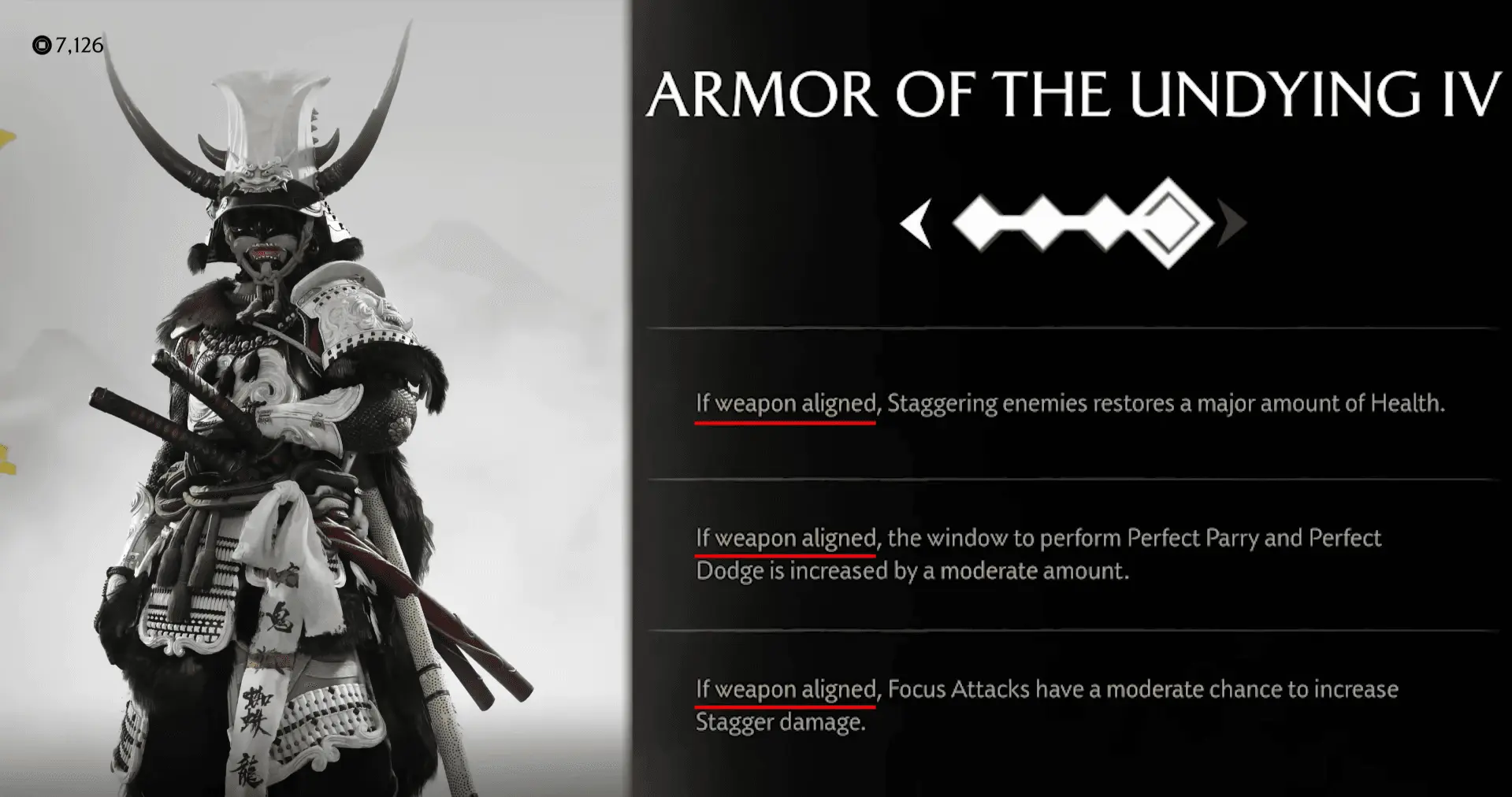 The armor also enhances perfect parry and dodge windows during weapon alignment, making defensive maneuvers more forgiving. Focus attacks (charged heavy strikes) gain bonus stagger damage, though this effect triggers inconsistently.