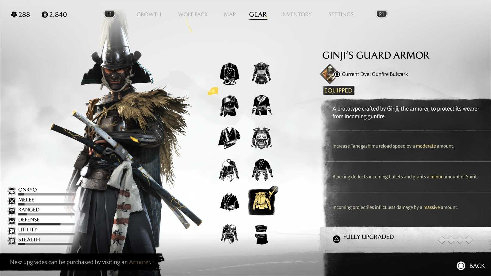 While the Onryo Armor's core abilities advance through story progression, you can still enhance its defensive properties through conventional means. Visit Ginji the Armorer at various inns throughout your journey to: