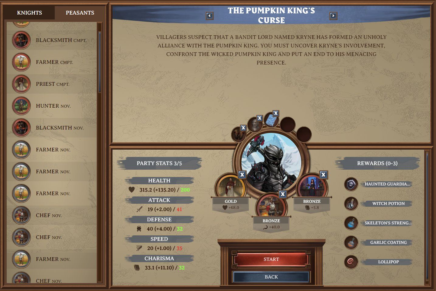 Knights & Peasants è un gioco di strategia ambientato in un mondo medievale. Come coraggioso giocatore, il tuo compito è inviare cavalieri e contadini in nobili missioni per ottenere potenti pozioni e armi formidabili, aumentando progressivamente la tua forza per affrontare sfide sempre più ardue.