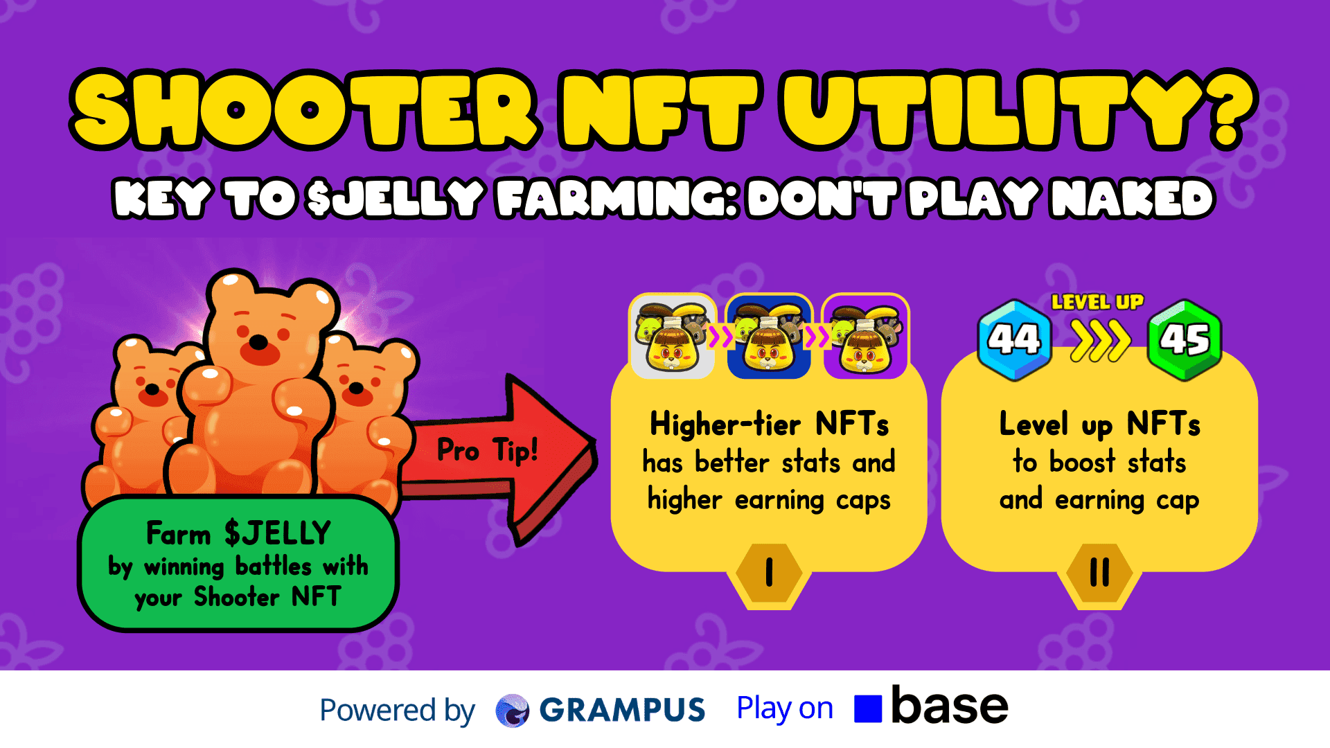 Juicy Adventure incorporates NFTs as a core part of its gameplay and economy. Shooters and Skins are available as NFTs, and these assets can be upgraded or traded to enhance their value and functionality. Shooter NFTs are tied to the $JELLY earning system, meaning players need them to maximize their rewards. These NFTs come with earning counts that can be recharged, ensuring they remain functional throughout gameplay.