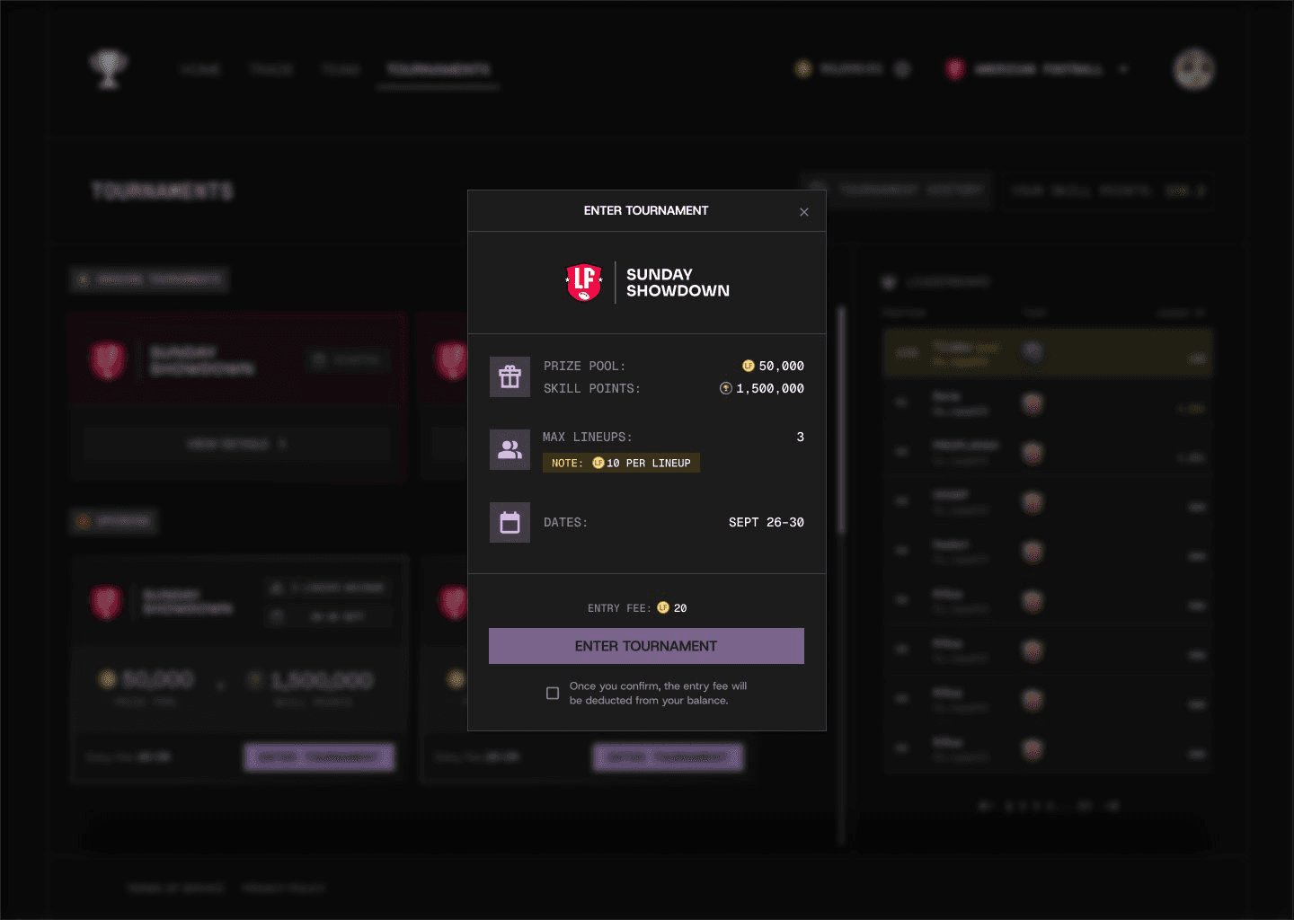 - Free Contests: No entry fees. Participants earn Skill Points (SP) and League XP (LXP), which contribute to the $LEAGUE token airdrop.