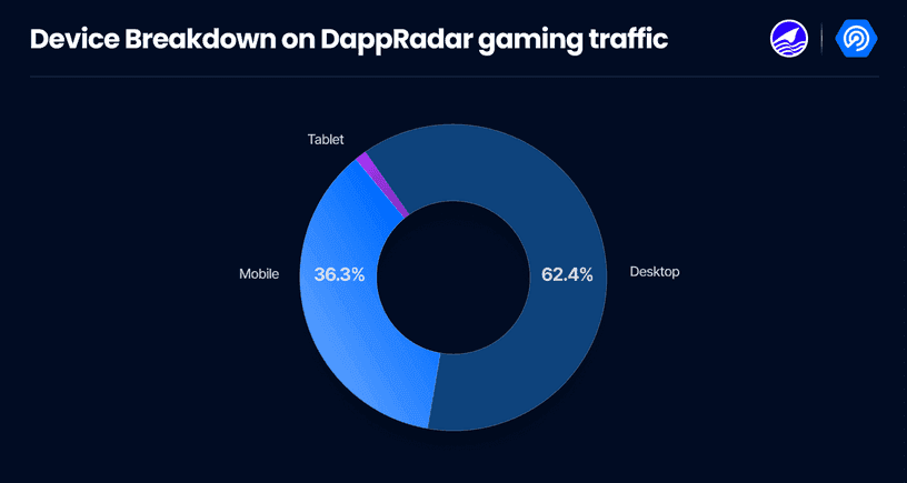 Upon diving deeper into the geographic data distribution based on the game rankings analysis from DappRadar, it is revealed that 32% of the audience comes from Asia. In terms of device usage, there exists a split of 62% on desktop and 38% on mobile platforms.