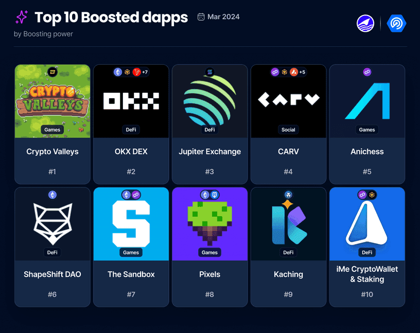 Of the highlighted dapps, five are categorized under gaming, each supported by gaming studios or teams hailing from Asian countries. These gaming ventures have showcased an impressive capacity to engage expansive communities through the boosting system, underscoring the crucial role of community backing in web3.