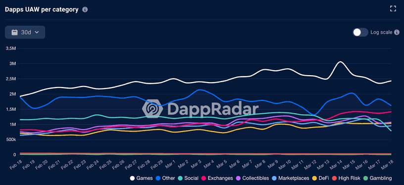 - Blockchain gaming comprises 35% of the total dapp industry’s activity, with approximately 2.2 million daily Unique Active Wallets.