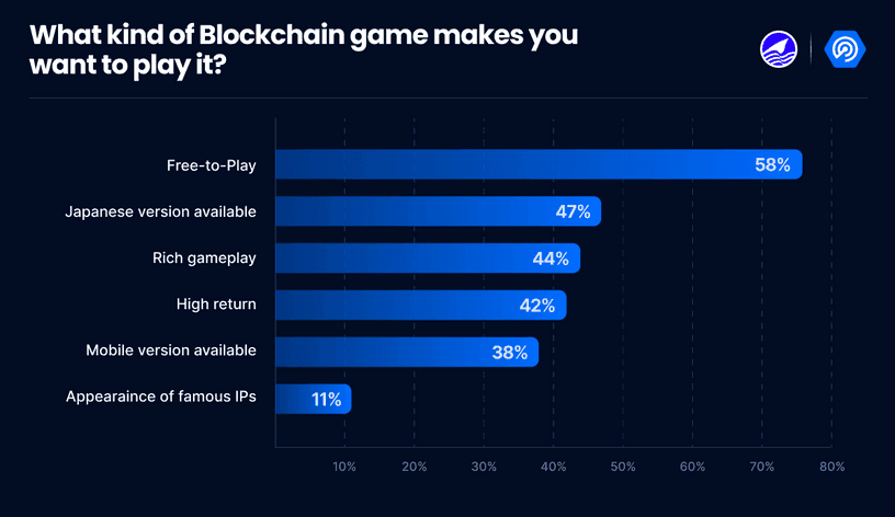 These preferences underscore the challenges faced by non-Japanese speaking games in a market sensitive to language barriers, reflecting Japan's relatively lower English proficiency. Moreover, it emphasizes the importance of streamlining the onboarding process for new players, allowing gamers to download and play a game without the complexities of purchasing NFTs or connecting wallets.