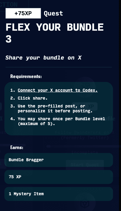 At every stage of your Bundle, you have the opportunity to share your progress on X and earn an extra Key. To avail of this benefit, all you need to do is complete the "Bundle Bragger" Quest. It's important to note that this action can only be performed once per level, irrespective of the number of Bundles you possess (with a maximum of 5 times). Make sure to post once at each level because retroactive participation is not possible.