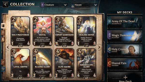 A gold-based resource system lies at the heart of the gameplay. Every decision on when to play or hold cards ties into this mechanic, rewarding players who can manage their in-game economy effectively. The result is a TCG mix that feels familiar yet fresh, blending Hearthstone’s traditional TCG flow with Legends of Runeterra’s hero level-up mechanics and an added layer of economic strategy through gold management.