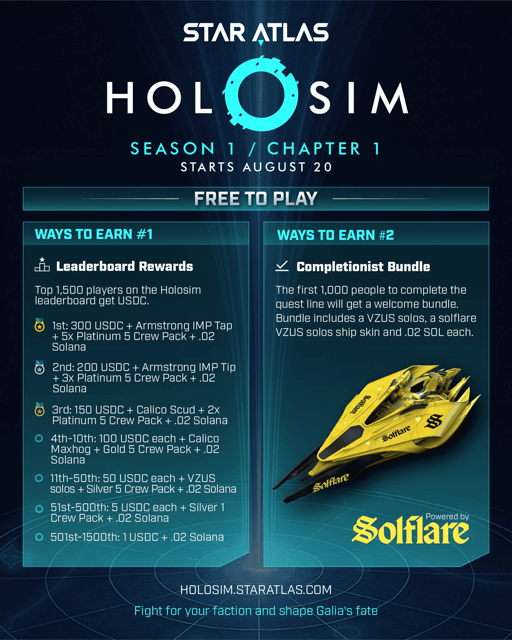 Holosim Season One Chapter One has officially launched on August 20. The browser-based strategy experience within the Star Atlas universe brings $35,000 in seasonal rewards while introducing a free-to-play entry point for players. Powered by Solflare, the new season emphasizes both accessibility and competition.