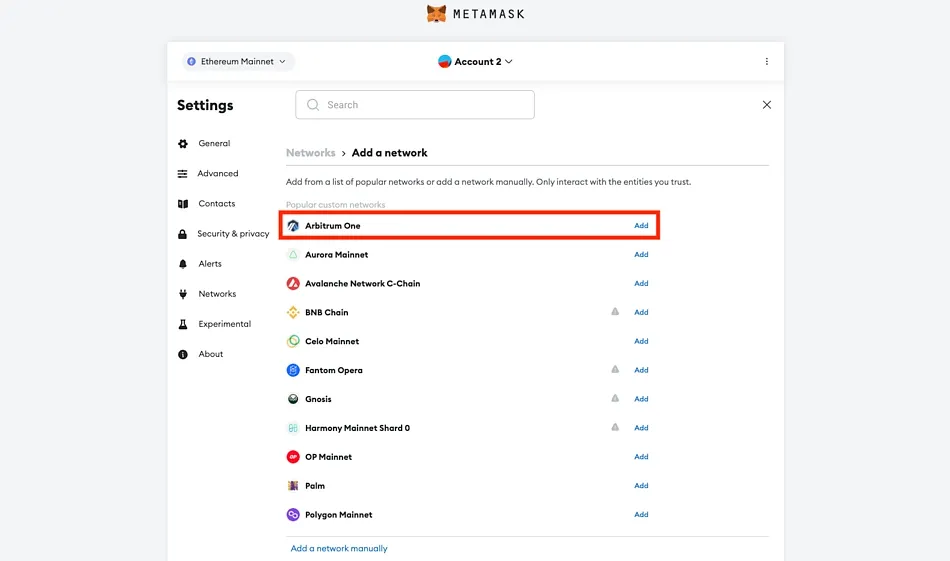 - Under Popular custom networks, look for Arbitrum One and click Add.