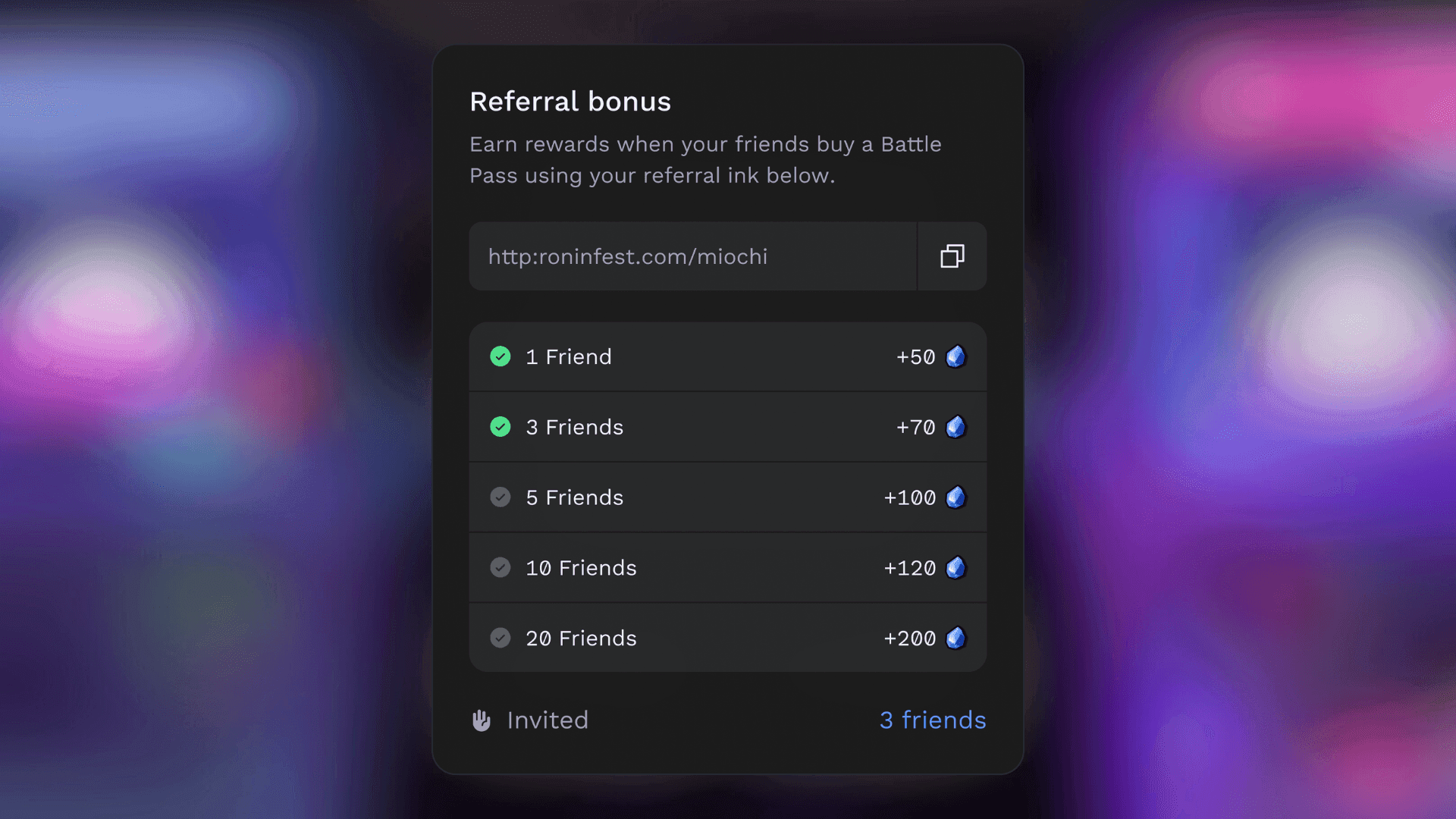 Ronin Arcade introduces a referral bonus program that rewards players for inviting friends to join. Participants who share their unique referral code can earn up to 540 bonus points, depending on the number of successful referrals. One referral earns 50 points, while three referrals earn a total of 120 points. This encourages community-driven participation and helps expand the player base of the Ronin ecosystem.