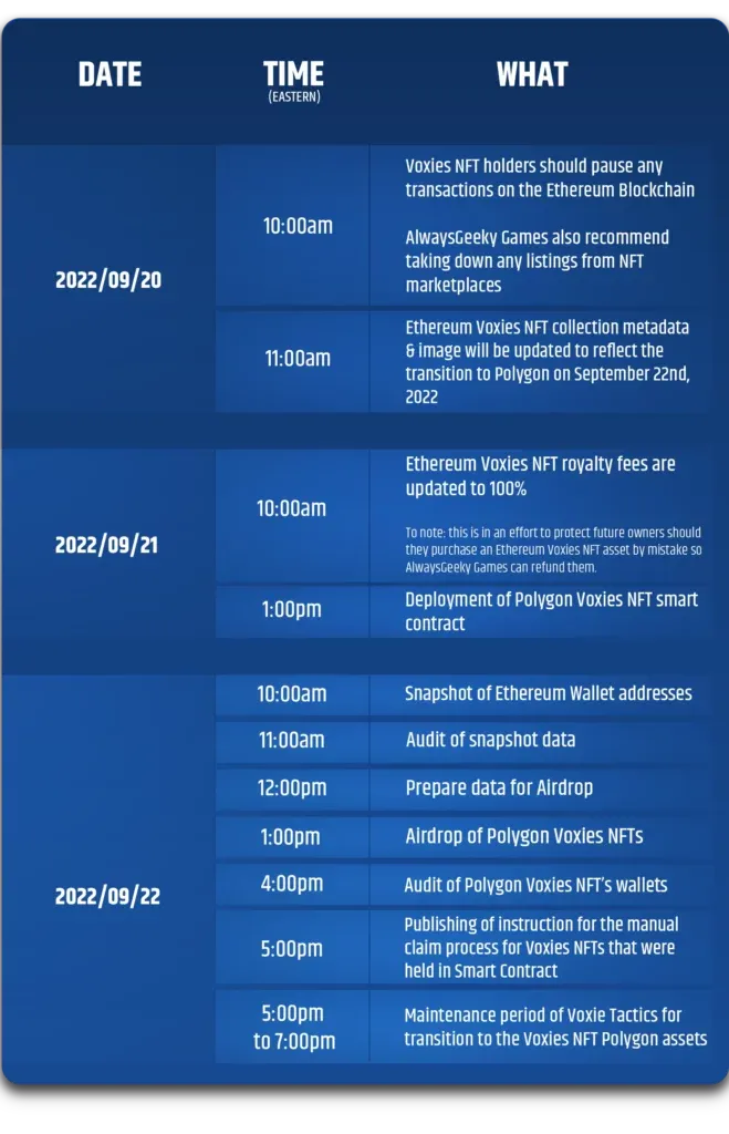 The team over at AlwaysGeeky Games shared a detailed breakdown of what will happen between 20th of September, when the transition will take place, and till the end of the process on 22nd of September. From 10 AM ET, all Voxie Tactics NFT holders are instructed to pause all trading, and even preferably taking down any active listings. From their onwards, the team will deploy the Polygon Voxies NFT contracts at 1 PM ET on 21st of September. Once done, users will receive the same assets they used to hold on Ethereum on Polygon following the snapshot at 10 AM ET on 22nd of September.