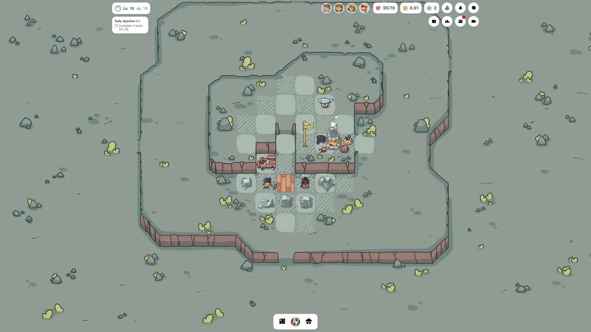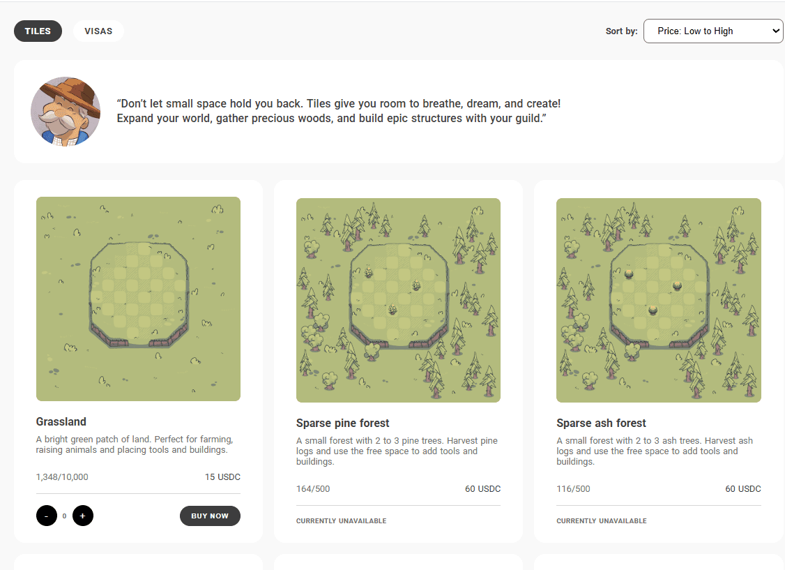 Players begin by creating an account and spawning on a starter tile. Early quests teach basic actions such as harvesting, crafting, and interacting with NPCs. Completing these tasks grants resources and experience that unlock the ability to claim new tiles. Over time, each player’s domain expands into a unique settlement, connected to those of others in an endless world map.