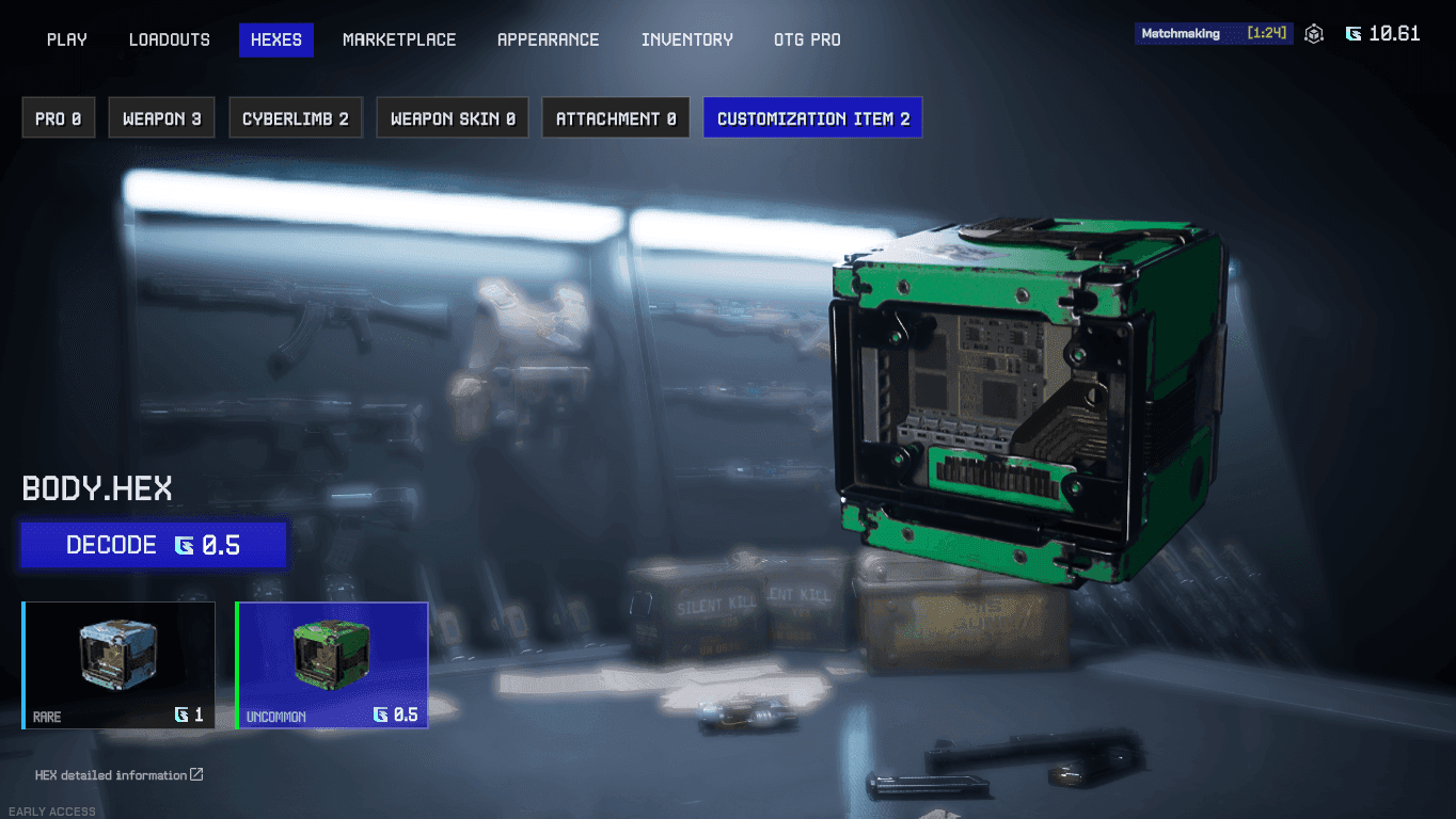 Hexes function like loot boxes, containing various in-game assets such as weapons, attachments, skins, cyberlimbs, and cosmetics for your avatar. These items, often NFTs, can be traded or sold in the in-game marketplace, adding a strategic layer to gameplay.
