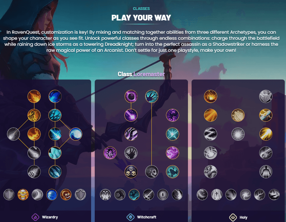 RavenQuest takes a different approach to traditional MMORPG gameplay by offering complete freedom in how players build and progress their characters. Instead of locking players into a specific class, RavenQuest introduces an Archetype system where players can combine three Archetypes at any time. There are eight Archetypes to choose from: Archery, Holy, Protection, Shadow, Spiritual, Warfare, Witchcraft, and Wizardry. Each Archetype offers 18 unique spells, and combining three creates up to 56 possible class combinations. This system allows players to adapt their character to suit their playstyle, whether they prefer to be a long-range damage dealer, a tank, or a spellcaster.