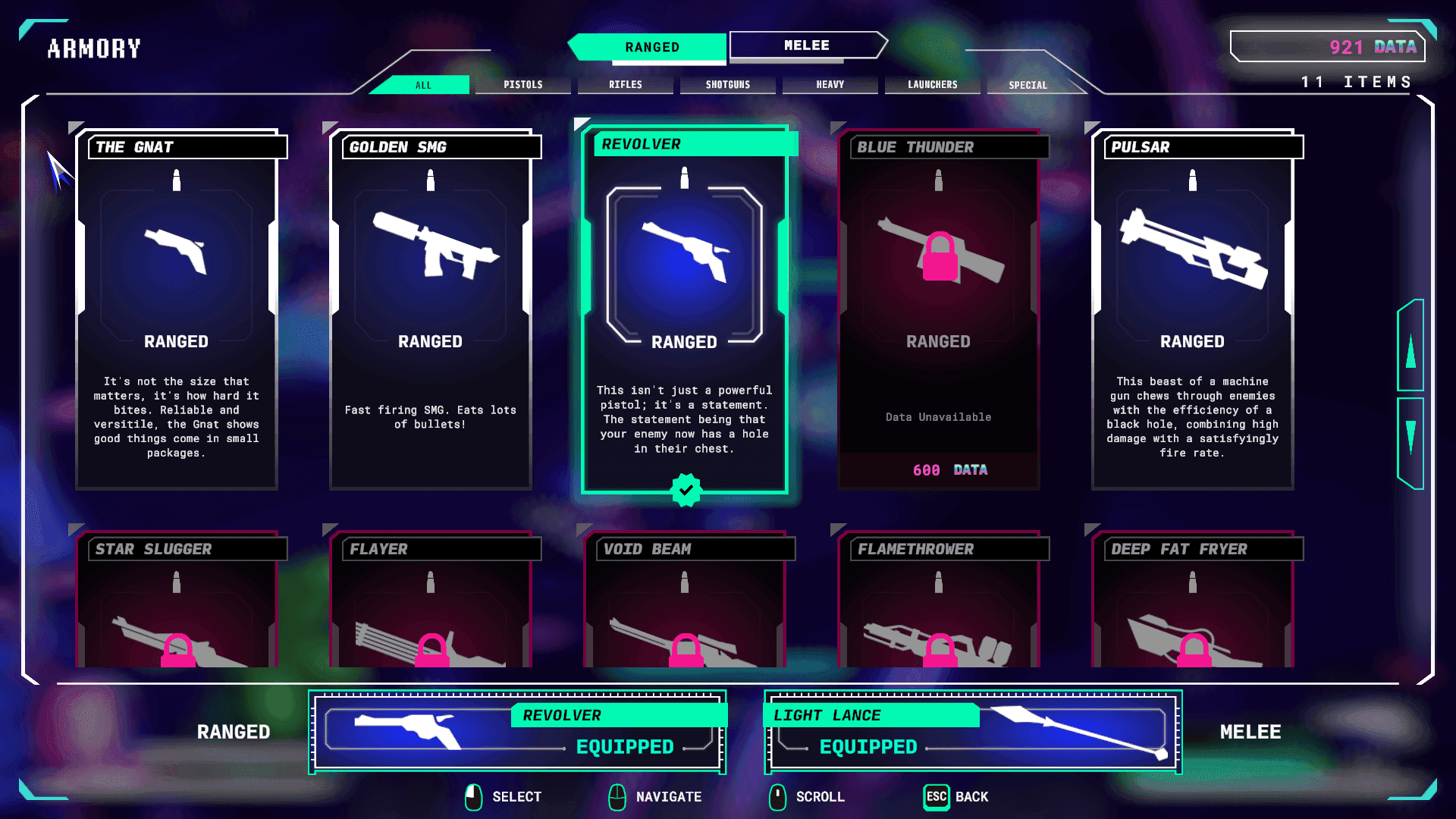 Weapons span pistols, rifles, shotguns, heavy weapons, launchers, specials, and melee options. Each weapon class offers different roles, from the reliable Gnat pistol to high-damage heavy weapons like the Deep Fat Fryer. The variety encourages players to experiment and find loadouts that suit their style.